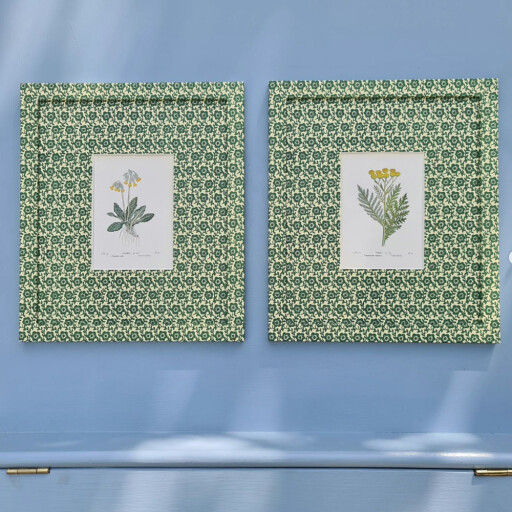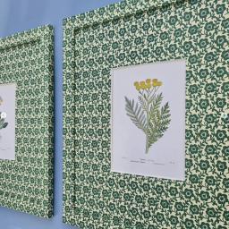 A pair of statement frames with matchy matchy decorative mounts enclosing pretty botanical prints.